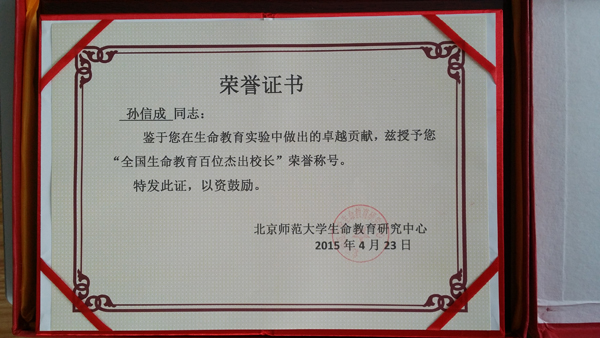 孙信成在生命教育实验中做出的卓越贡献,被授予“全国生命教育百们杰出校长”荣誉称号 北京师范大学生命教育研究中心