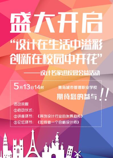 经过前期的精心筹备与策划,我们定于2016年5月13日下午两点在青岛城市管理职业学校举行“设计在生活中溢彩,创新在校园中开花——设计名家进校园公益活动”首期活动。活动包括启动仪式、讲座环节及论坛环节。